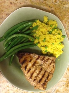 Great fish recipe from my friend Missy, which you can see at her site, Recipes by Missy. This would probably work pretty well with any sturdy fish steak. I served this with saffron rice and garlic green beans.