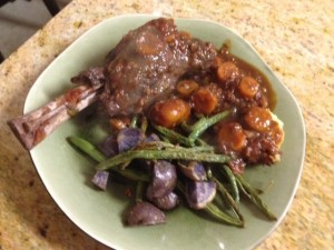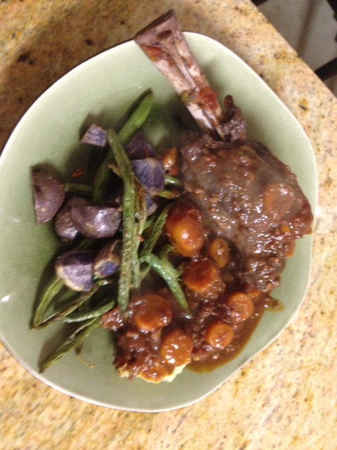This was my first time making lamb shanks, and I was pretty happy with the results. They were very flavorful and tender. I served them with a side of savory polenta and garlic green beans and purple potatoes…made for a very festive meal! It also made some very nice lamb stock when finished.
