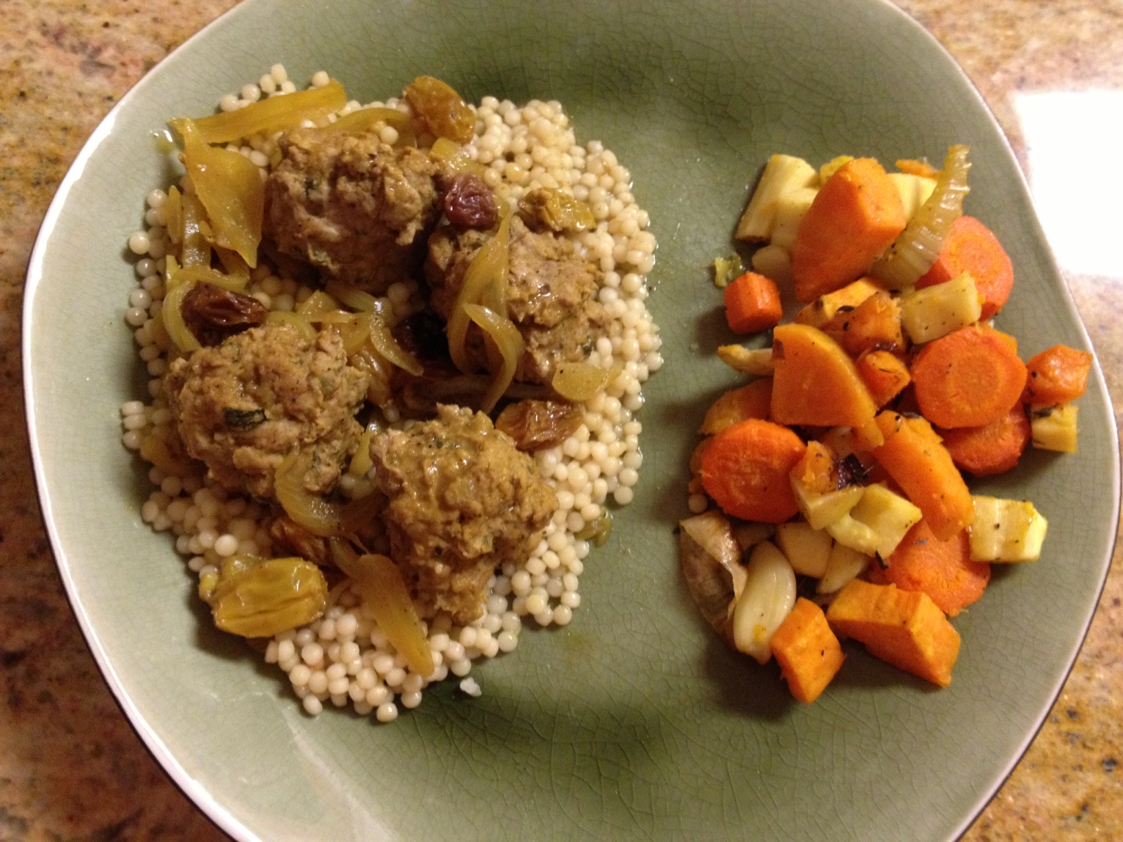 Kefta is a ground, seasoned meat mixture from the Middle East and is usually made from ground beef or lamb. This is a somewhat healthier take on the dish using turkey in place of the red meat. I’ve made this dish a few times, and really like it every time. The only tweak I ever make from the original is to double the Ras El Hanout spice mixture (which you can get from a store such as Penzey’s or make yourself). The original came from Cooking Light a few years ago. I served this over couscous with roasted root vegetables on the side.