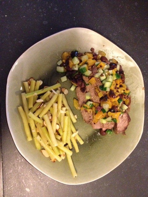 First dinner in our new house! And add to that the fact that I am a first-time homeowner and this is all pretty exciting. 🙂 Coming from a small (understatement) kitchen in our rental, it was pretty awesome to be back in a large, relatively modern kitchen again. After weeks of eating out with our kitchen packed, it was also excellent to have homemade food again. This was a recipe I saw in Cooking Light and modified a bit. The original called for pickled pepperocini, but I couldn’t find any. Instead, I used roasted yellow peppers and olives to get some brine/tang. We really enjoyed this – I served it with yellow wax beans tossed with some toasted almonds.