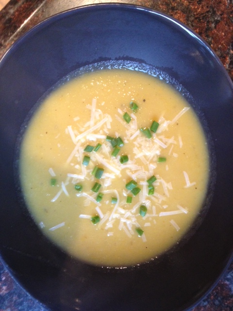 After not-so-fun dental work today, and strict orders not to chew, some kind of soup seemed in order. Not to mention it was an ugly rainy day…perfect for a yummy soup. I had gone to a great little cafe with one of my managers a couple of weeks ago, and we’d had a delicious yellow and orange pepper soup – I was dying to try to recreate it, and this was a good opportunity! This was a mish-mash of a few recipes, but what I liked about the base (from Epicurious) was that it didn’t use cream or milk – the thickness comes from a couple of potatoes. I used chicken stock in this because that’s what I had, but I think it would be better with vegetable stock and would of course be an easy vegetarian option that way. It was delicious and healthy…definitely going in the regular rotation!
