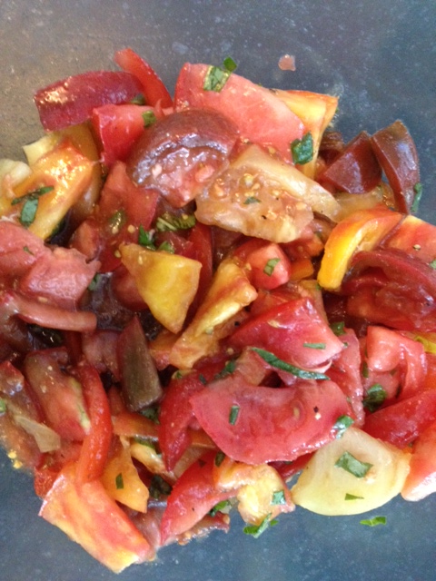 Combine sliced tomatoes, basil, parsley, a drizzle of olive oil and balsamic vinegar, and a pinch of kosher salt and freshly ground pepper and gently toss. That’s it! Alter to taste.