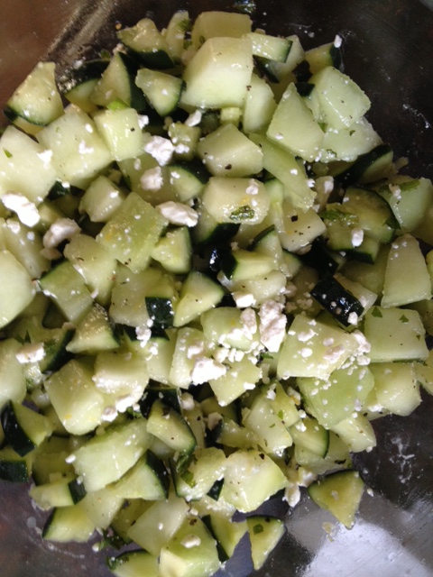 I was surfing around for interesting salad ideas for our Memorial Day cookout, and this one caught my eye on Chowhound. It seemed like a pretty nifty one, and I really liked it. Very refreshing and easy. Plus I love anything that includes cucumber and mint, so there you go. I would definitely repeat this with any number of grilled main dishes for a nice summer side salad.