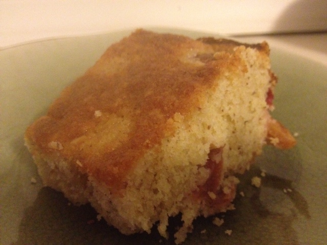 This is a nice dense cake with a spongy texture that is great with some whipped cream or as a coffee cake. Or just by itself. 🙂