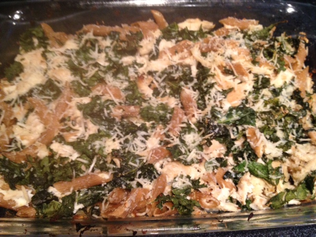 We got a big, lovely bunch of kale in our CSA this week that needed a job. I was contemplating something to do with it besides a soup, and found this casserole on Serious Eats (originally Martha Stewart, I think). It’s nice for a summer casserole – lighter and very bright. It made a ton of course, which was my intent…lots of lunches! This was pretty easy to make a bit healthier with whole wheat pasta, part-skim cheeses, and Smart Balance instead of butter.