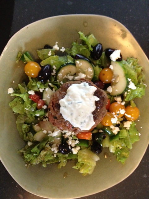 What can I say…this one may have become one of our absolute favorites! Hugely flavorful for not a lot of effort. In my low-carb recipe idea search, I saw a pita-less gyro, and that gave me the idea to do a lamb burger over a Greek salad. We topped the burger with some not-quite-tzatziki and it was delicious. I used a Bon Appetit recipe for this, and made no changes. Great as-is. I kept the salad on the lower-cal side by cutting the oil substantially when I made the dressing. We definitely didn’t miss it.