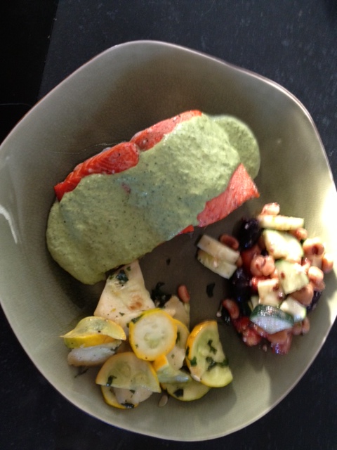 In my epic quest to use up all the basil we’re growing, I made a cream sauce and froze it a few weeks ago…so most of the recipe is that. But it was excellent over baked salmon filets. I served this some sauteed squash from our CSA, and a cucumber and white bean salad. The sauce was fantastic…glad we have more in the freezer. That said, if you make this, freeze in SMALL portions – a little goes a very long way. This would do well with chicken or roasted veggies as well.
