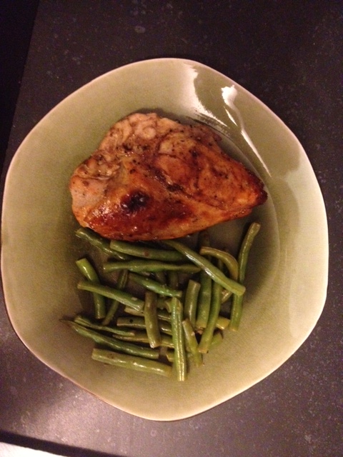 We were really happy with this tasty, easy baked chicken dish, which came from a recipe database called RecipeSource. I did halve the sugar in the recipe from 1/2 cup to a 1/4 cup, so the rub was more watery than intended. But lost no flavor and it stayed on the chicken without trouble. The sweet rub on the chicken paired really well with some spicy garlic roasted green beans as a side. It also made a lot – I used four split chicken breasts, but you could really use any chicken you liked – a whole cut up chicken would be great for leftovers.