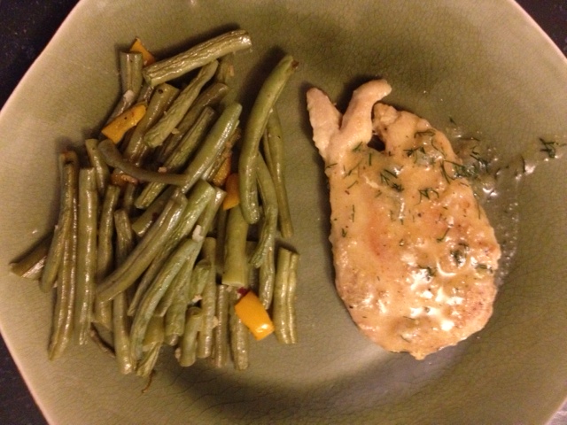 We have a CSA dill plant that is flourishing when most of our other plants have kind of had it…went searching for an easy weeknight dill recipe and here’s what we found! This came from an old issue of Gourmet magazine. We enjoyed it and it was a pretty fast meal – the original recipe called for chicken legs, but I used chicken breasts and it was fine. Otherwise no changes. Definitely a make-again, but I do think I’d add more mustard next time.