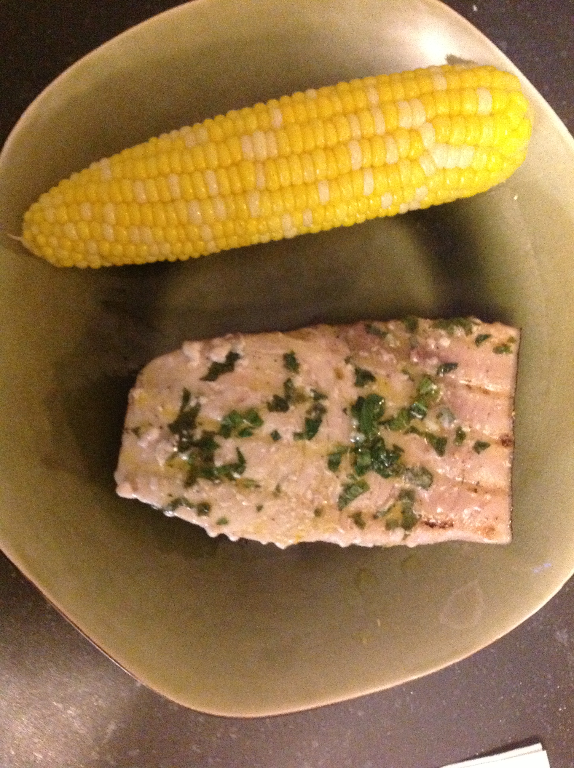 Given it was Labor Day weekend, we wanted to spend some QT with the grill – which is kind of silly because it’s not as though it’s going to be 5 degrees now that “summer is over.” But it was a good plan, since there was some deliciousness going on! This was a nice swordfish recipe that I got from Giada De Laurentiis and substituted lime for lemon because I thought it would go well with the rest of the flavors, and modified to serve just two. There was a lot of sauce left, so I think you could cut back the oil even further – we threw a lot out. Definitely a winner. Very filling with corn on the cob for a side.