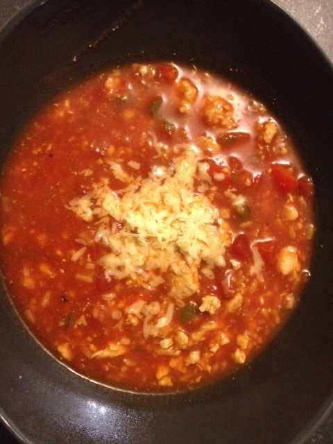 Add stock and tomatoes and bring to a boil. Simmer for 10 minutes or so, then add rice (if using minute rice). Otherwise, cook rice separately, simmer for another 20 minutes and add rice at the end. Sprinkle with your favorite shredded cheese (we used very sharp cheddar).