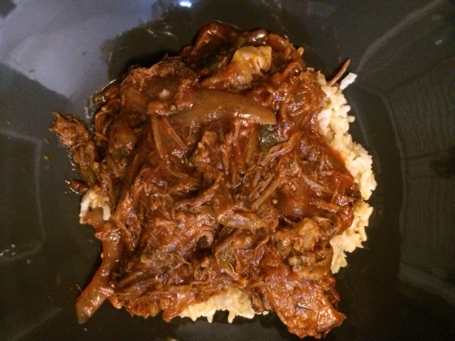 With a slotted spoon, remove the onion, garlic and peppers from the crockpot and sauté in a large frying pan. Add the tomato sauce, tomato paste and beef broth. Add the shredded beef to the tomato mixture and cook together for about 20 minutes, stirring occasionally. Serve with rice. We used brown – white would be better – or none at all, it’s still amazing!