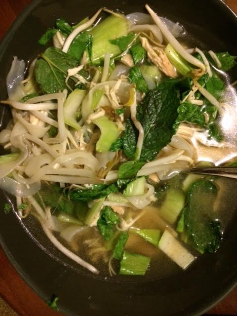 Remove the chicken from the bone and shred with two forks. When the noodles are tender, stir in the shredded chicken. Serve bowls of soup with bean sprouts, basil, mint, cilantro, sliced chile and lime wedges on the side so everyone can add their own toppings.