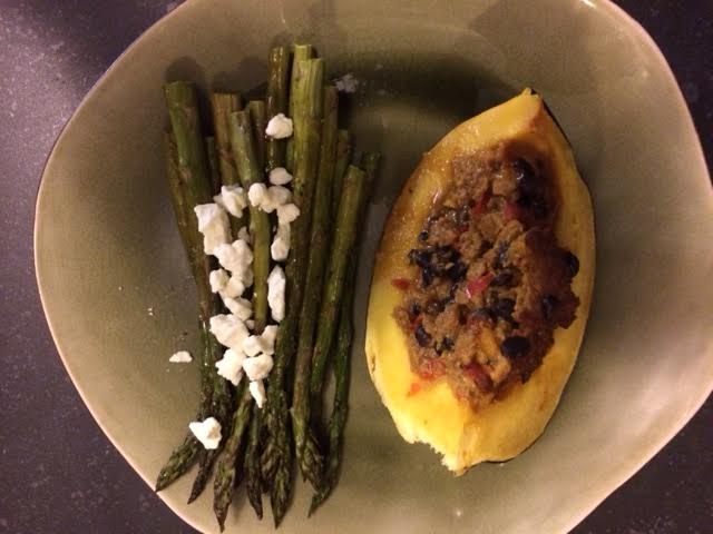 We try to eat vegetarian once a week, although it doesn’t always work out. But there are so many great options out there, we really should make more of an effort. This was awesome – I got the recipe idea from a curried squash idea from MorningStar Farm’s website, and modified it to make it a little more southwest-themed. Definite make-again.