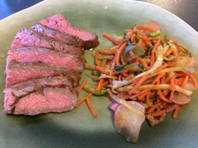 This was an easy and tasty modified Cooking Light recipe – modified because I marinated it for 8 hours, rather than putting sauce on it and cooking it. Being a flank steak, I was skeptical of how tough it would be if it had no marinade at all. This came out well, especially because Shawn grilled it – thank goodness we’re getting back to grilling weather! 🙂 We had this with spiral zucchini, carrots, and radishes as a “noodle” side, tossed with some soy sauce and black vinegar.