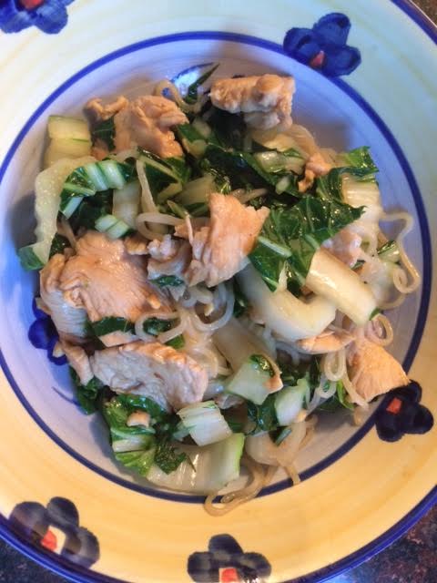 Stir fry is not something I usually bother with a recipe to prepare, as it’s a great clean out the fridge opportunity. But I saw this on Rasa Malaysia and wanted to give the idea of it a try, simply because we love bok choy. I almost never use chicken in my stir fry, because I suck at cooking it any way but braised/baked/handed to Shawn to grill. Otherwise it’s gummy, tough, and dry, yum yum! But this was actually a great technique and I will do it again. The sauce was light, and I found myself thinking that this would be a lovely summertime meal with additions from the garden to accompany the bok choy. We bulked this up with some shirataki noodles instead of rice.