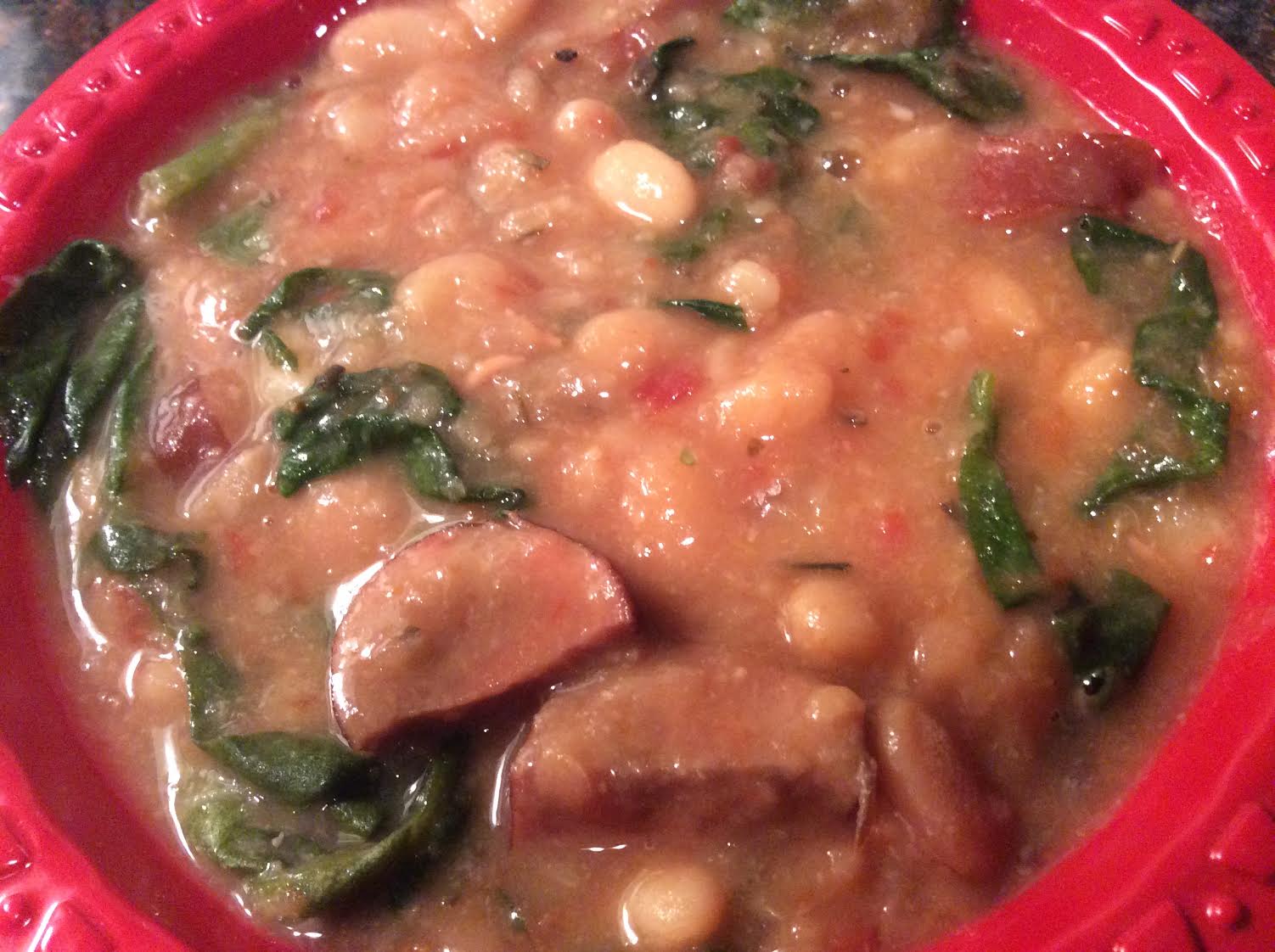 Combine the beans, kielbasa, broth, tomatoes (and their juices), onion, garlic, and rosemary. Cover and cook on low until the beans are tender, about 8 hours (5-6 on high).