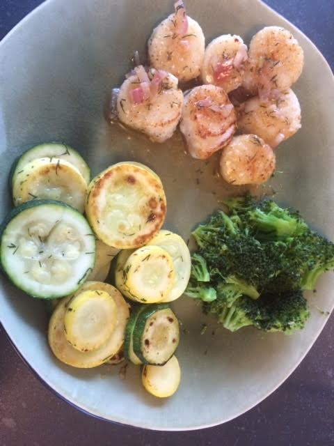 We were looking for a quick, light weeknight summer meal and this was great. I feel like there are only so many ways to prepare scallops (my preference is always seared), but we really liked this sauce! From Bon Appetit, I made it pretty much as listed except I dusted the scallops with flour for a nice sear, and cut out the lemon peel – we don’t love things too lemony. We had this with sautéed squash from our garden and some steamed broccoli (and some of the wine used to cook the scallops 😉 ).