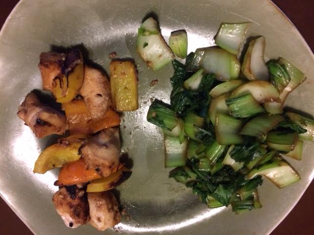 Missy sent me this really excellent chicken marinade, and we had to give it a try. It’s Asian-y and delicious. We made a few changes, cut back on the spice a bit because we’re not huge on heat, and added a couple of cloves of garlic. It was great and we’ll definitely do it again – the leftovers for lunch will be awesome. We had it with some bok choy as a side.