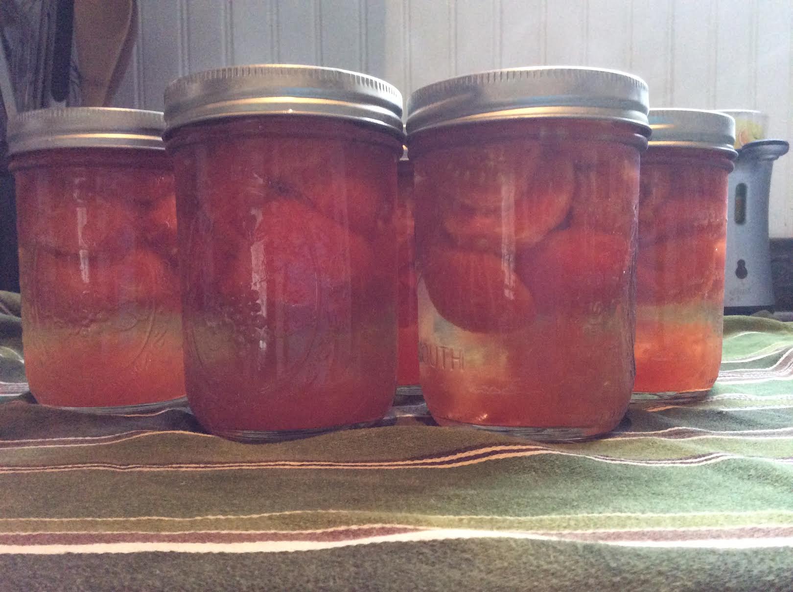 You’ll know they have sealed in the AM if you press down on the lids and they don’t bounce back. It is normal for the tomatoes to rise to the top of the jar as in my photo – I could have packed more in there, but was being careful.