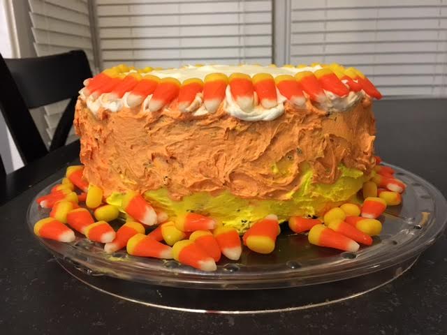 This is actually a chocolate layer cake with vanilla buttercream frosting, decorated in candy corn colors for our Halloween party. 🙂 This was a cake recipe I hadn’t tried before, but it was pretty good even for this non-chocoholic, so I will use it again. A fun dessert for the holiday! Got the idea from an article about Halloween-themed desserts.