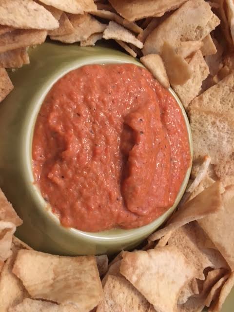 This is a simple, healthy dip that is great for a party or just a snack. I used jarred peppers for this, but freshly roasted peppers would be extra awesome. We served this with pita chips. This is from Cooking Light.
