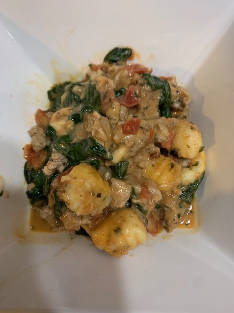 Gnocchi is an easy thing that I can eat and also makes for fast weeknight dinners. If you are watching for gluten-free food, DO read the back of the box – while gnocchi is generally a potato-based pasta, it often has wheat included. I liked this recipe because I think you could sub ground chicken as well, so you have options if you can’t find ground pork. You could also add any number of veggies. It’s a great base recipe that I’ve used several times now, with or without meat.
