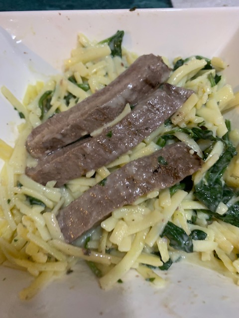 I’ve been planning to experiment with fettuccine sauce with dairy alternatives besides cheese, and this was a great success. We had a flank steak hanging out in the freezer that was perfect for this, and I liked the idea of using steak instead of chicken – if the sauce was lackluster, the steak has a stronger flavor than chicken. But the sauce was great, and I would definitely make it with either chicken or steak. We did use gluten free noodles.