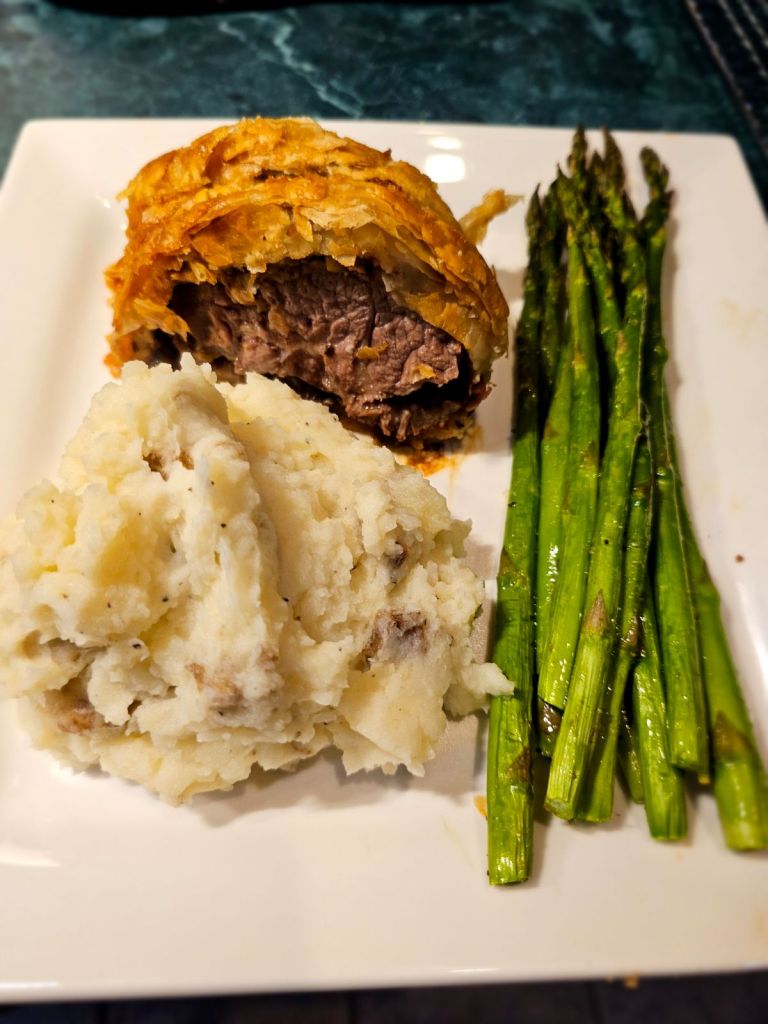I admit that I’ve always wanted to try making Beef Wellington, but never had wanted to take it on. We were looking for something fun to make for Valentine’s Day, and decided to finally give it a go…and I wish I had done so sooner, as it was excellent. Labor intensive, but worth it. Of course I used Gordon Ramsay’s recipe as a guide, but I have to say that I also used Delish’s recipe as well. I’ve been very pleasantly surprised with their recipe ideas. Two things of note – I made two Wellingtons, one with a gluten-free pastry crust, and one with a regular. The gluten free was still delicious. Second, neither of us likes mushrooms too much, so I made the duxelles with caramelized onions and olive tapenade. Still fantastic.