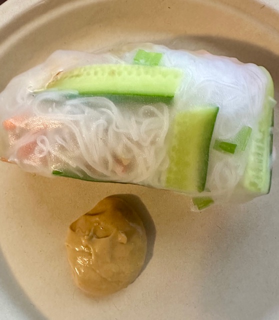 Using a pie plate or other shallow dish with warm water, soak each spring roll wrapper for 15-20 seconds to make them pliable. Spread out on a damp cutting board, and fill each wrapper with noodles, chicken, and vegetables, and fold closed. You can use whatever lettuce or herbs that you like. Don’t overstuff them, or they will fall apart!