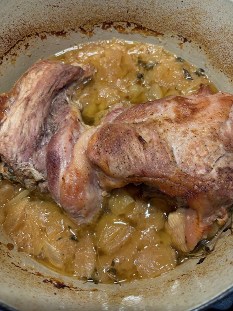 Remove the pork and add the onion wedges, letting the onion get a little browned. Add the apples, stir together, and place the pork on the bed of onions and apples. Add the cider and bring to a simmer. Toss in the time, wedged around the roast and into the onions and apples.