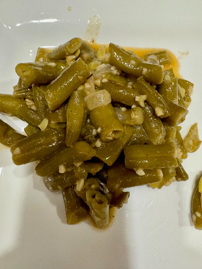 I can never get enough of green beans cooked this way, and while it’s more common to see them as a BBQ side simmered with bacon or salt pork, this is actually my favorite. An onion, some garlic, and I like a bit of celery too. The flavor comes from apple cider vinegar and smoked paprika. I would love to tell you where I got this recipe, but it’s almost 30 years old, and with so many adds and changes, I honestly have no idea. That said, if you look up smothered green beans, especially Southern-style, you’ll find all kinds of variations on this. I don’t know why I’ve never posted it – but I am making an effort to start to include my older “recipes by rote” so I don’t lose them!