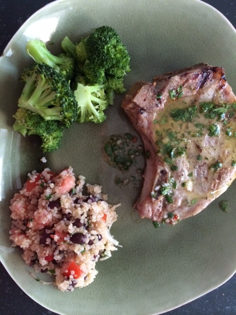 So this was great. Probably we’re just enamored with any good pork chop recipes right now, but this is seriously worth a go. I like how adjustable it is. I actually think the “sauce/vinagrette” would be even better over fish, so I’ll use it again for that. We served this with steamed broccoli and tomato and black bean quinoa.