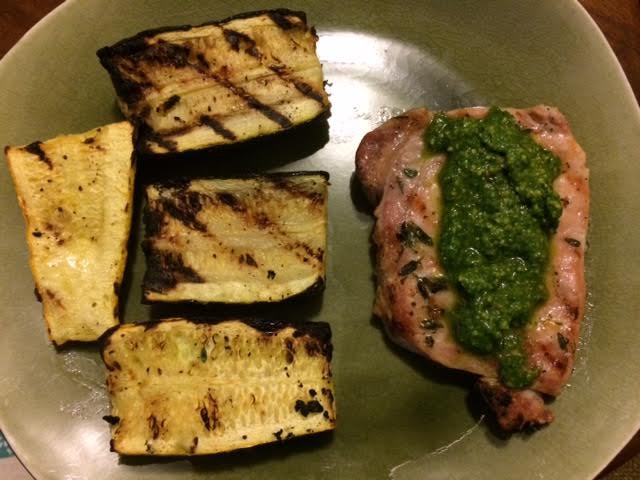 This was another grilled pork chop recipe (and we have yet to tire of grilled pork chops!) that we liked a lot. Very easy for a weeknight dinner. There were no bone-in chops at the store, but the thick boneless were actually fine. I did do a quick brine of these before the herb rub/grilling. The pesto was from our basil, and we grilled some of our squash as a side. This came from Serious Eats.
