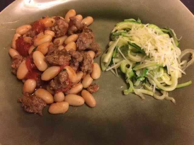 This was a super quick, tasty, weeknight dinner. We did not put this over pasta (low carb considerations for me), but I actually think that it would be way too much if you did – the beans were plenty. We really liked this! Totally one to make again. We had this with garlic zucchini spirals.