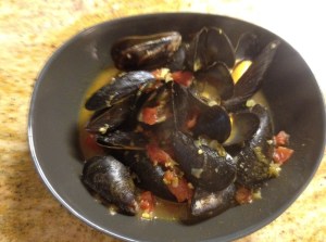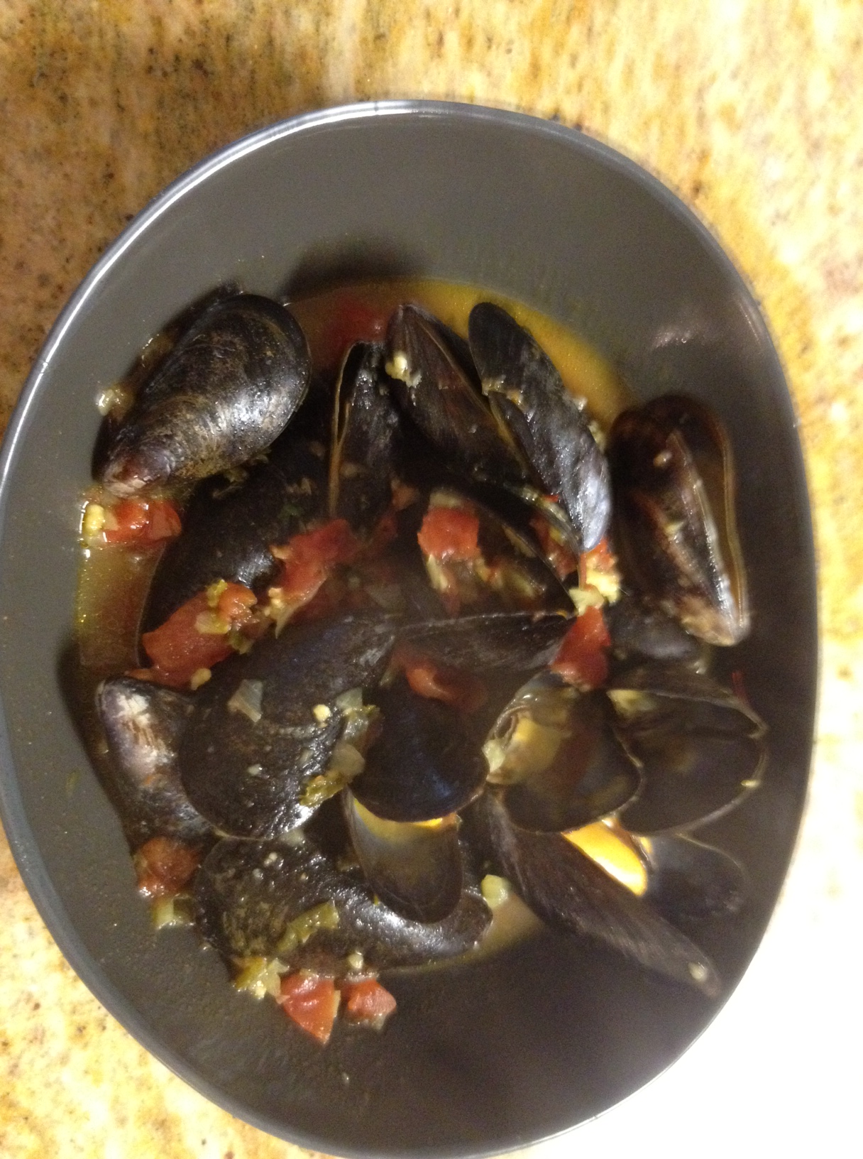Mussels are one of my absolute favorite things, and this is a fast, easy way to make them. I just served this with some crusty bread on the side to soak up the sauce. Although this served two of us, it could easily have been for three, or even four with sides. We had to stuff ourselves silly to finish it all because the mussels wouldn’t keep. So keep that in mind if this is a meal for two.